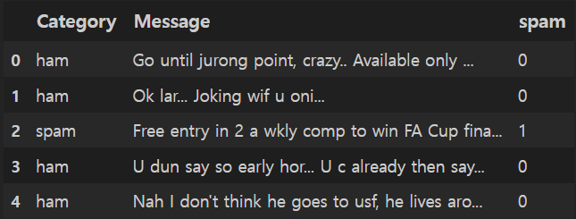 그다음 spam.csv를 통해 예시 데이터를 가지고 옵니다. 추가적으로 스팸 메일 여부를 숫자로 이진화해주기 위해 apply함수를 사용하여 spam = 1, ham = 0으로 설정해줍니다. 참고로 spam.csv파일은 아래 첨부해 드렸습니다.