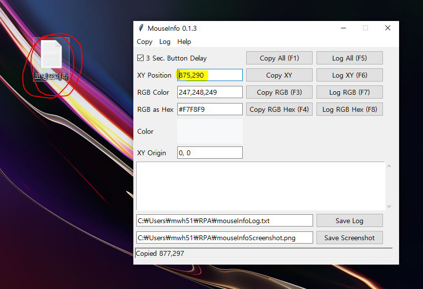 그러면 화면상의 x, y좌표는 어떻게 구할까요? 바로 pyautogui.mouseInfo() 함수를 통해 구할 수 있습니다. 아래 코드를 실행하면 아래 그림과 같은 창이 나옵니다. 여기서 원하는 위치에 마우스를 가져다 놓으면 해당 위치의 (x, y)를 알 수 있습니다. 아래 그림에서는 제가 '코딩 오페라'라는 메모장의 위치를 알아본 결과 (875, 290) 임을 확인할 수 있었습니다.