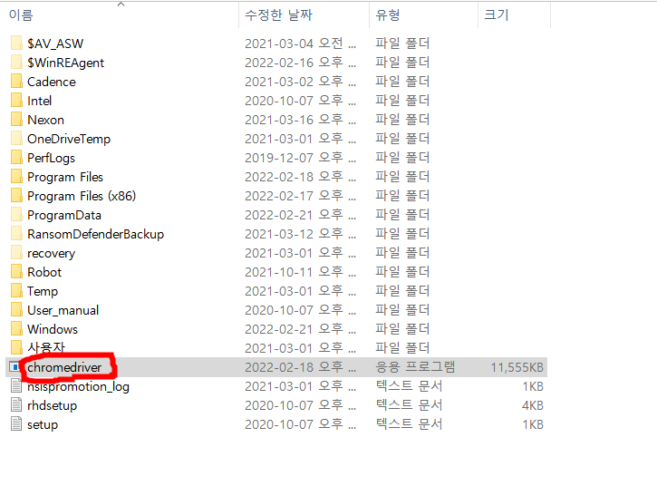 다운도르후 zip 파일을 압축을 풀어주면 다음과 같이 chromedriver가 다운로드된 것을 확인하실 수 있습니다.
