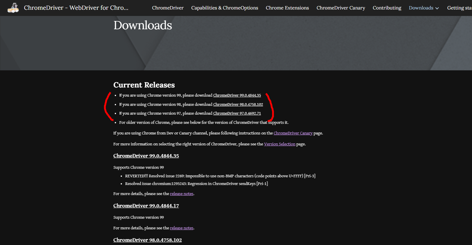 Current Releases If you are using Chrome version 99, please download ChromeDriver 99.0.4844.35 If you are using Chrome version 98, please download ChromeDriver 98.0.4758.102 If you are using Chrome version 97, please download ChromeDriver 97.0.4692.71 For