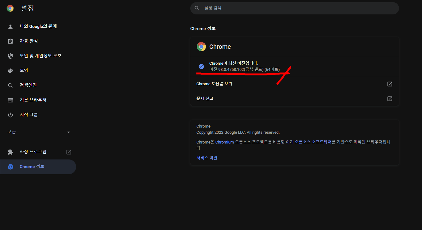 크롬 버전 확인은 크롬 브라우저의 오른쪽 맨 위 설정 -> Chrome 정보에서 확인을 하실 수 있습니다. 아래 그림을 따라 하시면 될 것입니다. 저의 경우 98 버전 이군요!