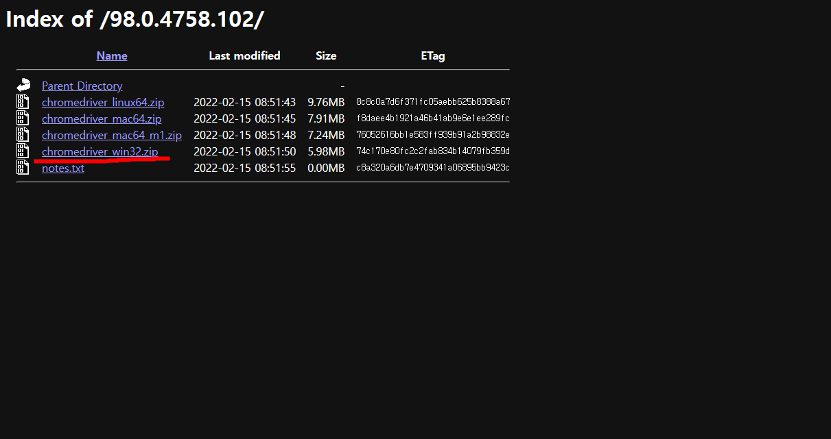 크롬 웹 드라이버는 아래 사이트에서 다운로드를 하실 수 있습니다. 아래 사이트에 들어가시면 다음과 같은 화면이 나오는데 이때 본인에 맞는 버전의 드라이버를 설치하면 됩니다. 저의 경우 98 버전을 설치하였습니다.