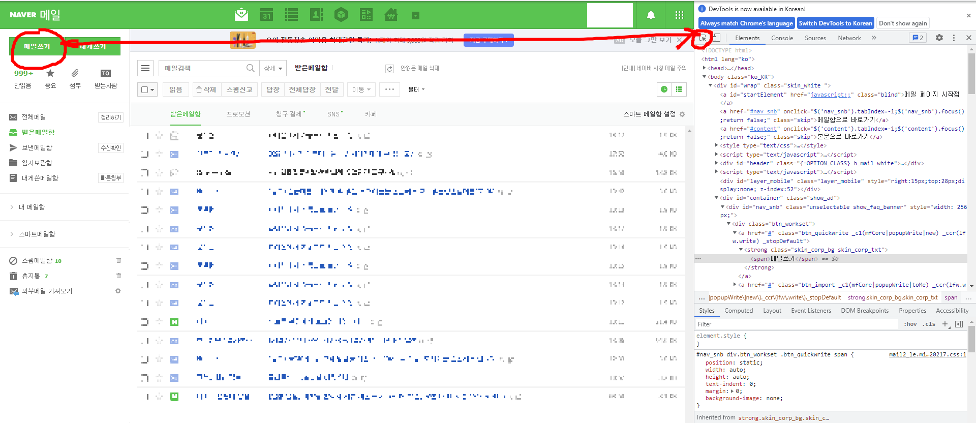 메일 함에 들어왔으면 '메일 쓰기'를 클릭해야 됩니다. 여기서 우리는 F12를 눌러서 자바스크립트코드를 보이게 합니다. 그 다음 아래 그림에서와 같이 스크립트의 왼쪽 맨위에 화살표 모양을 클릭하고 우리가 원하는 곳인 '메일쓰기'를 클릭해 해줍니다.