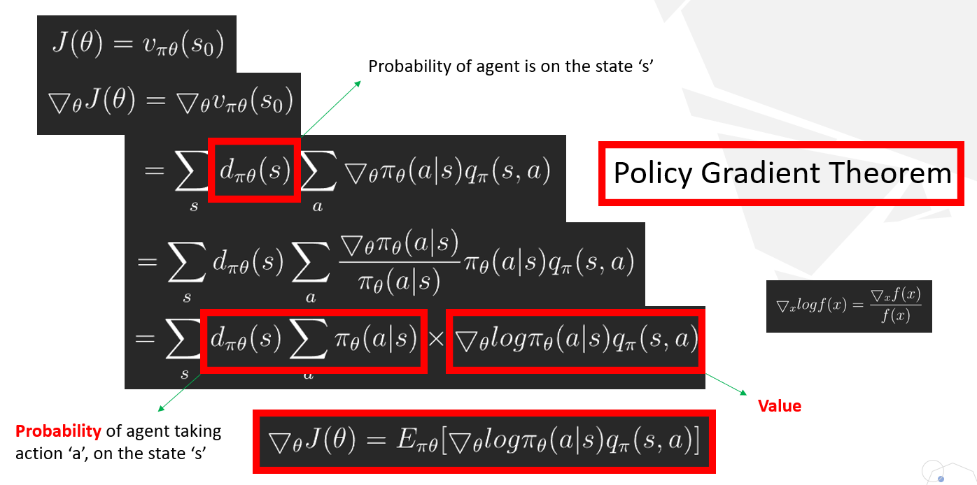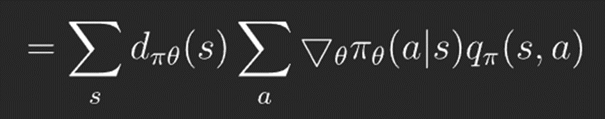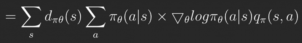 이를 미분하면 Policy Gradient Theorem에의해서 아래와 같은 식이 됩니다. 여기서 d(s)는 에이전트가 상태 s에 있을 확률을 의미하고, pi(a|s)는 에이전트가 상태 s에서 행동 a를 할 확률을 의미합니다. 따라서 이 둘을 곱하면 에이전트가 특정 상태 s에서 행동 a를 할 확률을 나타냅니다.