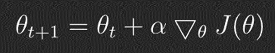 이를 최적화하는 방법은 미분값을 이용하여 '경사 상승법(gradient ascent)'을 이용하면 됩니다. 여기서 잠깐! '경사 상승법'이란 '경사 하강법'의 반대 개념으로 경사 즉 기울기를 향해 올라간다는 의미입니다. 그 이유는 loss함수에서는 loss값을 최소화해야 했기 때문에 '경사 하강법'을 사용했지만, 여기서는 누적 보상을 최대화해야 하기 때문에 '경사 상승법'을 사용하는 것입니다. 이를 식으로 나타내면 아래와 같습니다. 보시다시피 '+'를 사용한 것을 알 수 있습니다. 이렇게 경사 상승법을 따라 근사된 정책을 업데이트하는 방식을 폴리시 그라디언트(Policy Gradient)라고 합니다.