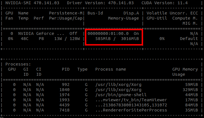 다시 터미널 창으로가서 해당 프로그램을 위의 코드를 이용해 삭제해주면 됩니다. 삭제후 GPU 메모리 사용량을 확인해보면 아래와 같이 여유가 생긴 모습을 알 수 있습니다.