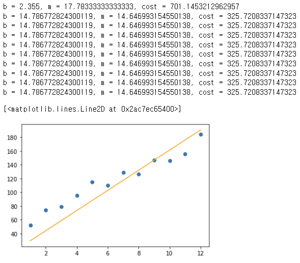 여기에 스탭을 반복해서 학습시켜주는 함수를 추가해주면 아래와 같습니다. 여기서 학습과정을 알아보기 쉽게 하기 위해. 학습을 100번 할 때마다 m, b, cost값을 프린트해주는 기능을 추가했습니다.