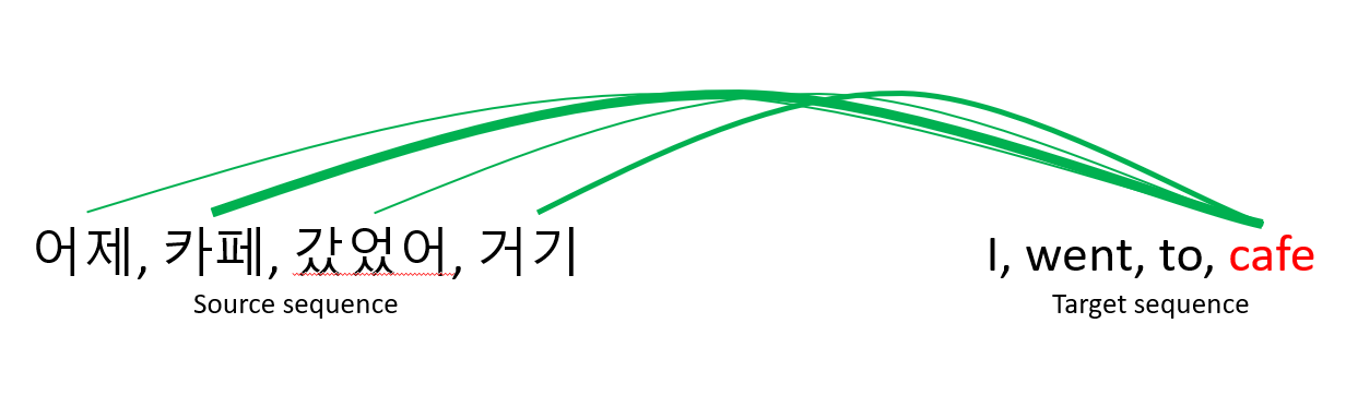 Attention이란 문맥에 따라 집중할 단어를 결정하는 방식을 의미합니다. 우리는 글을 읽을때 모든 단어들 집중해서 읽지 않습니다. 중요하다고 생각하는 단어에만 집중을 하고 나머지는 그냥 읽습니다. 이 방법이 문맥을 파악하는 핵심입니다. 이러한 방식을 딥러닝 모델에 적용한 것이 'Attention'메커니즘입니다. 위의 그림은 한/영 번역에서의 Attention을 나타내고 있습니다. 보시다시피 영어 'cafe'와 한국어 '카페'가 강한 Attention 상관관계에 있습니다. 이에 비해 다른 단어들과는 Attention이 약합니다.