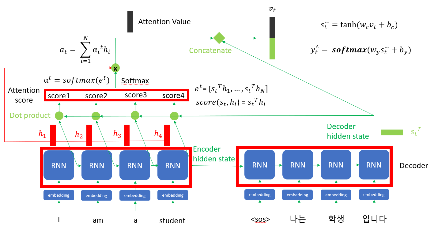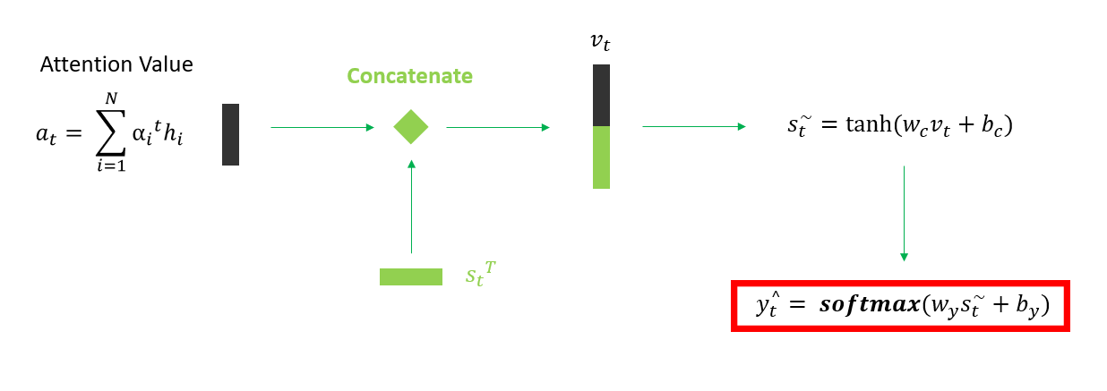 마지막으로 Decoder의 문맥을 추가해주기 위해 Decoder hidden state를 Attention value아래 쌓아 줍니다. 이 과정을 'concatenate'라고 합니다. 추가적으로 성능을 향상하기 위해 tanh, softmax 활성 함수를 이용해 학습을 시키면 최종적인 출력 'y'가 나오게 됩니다.