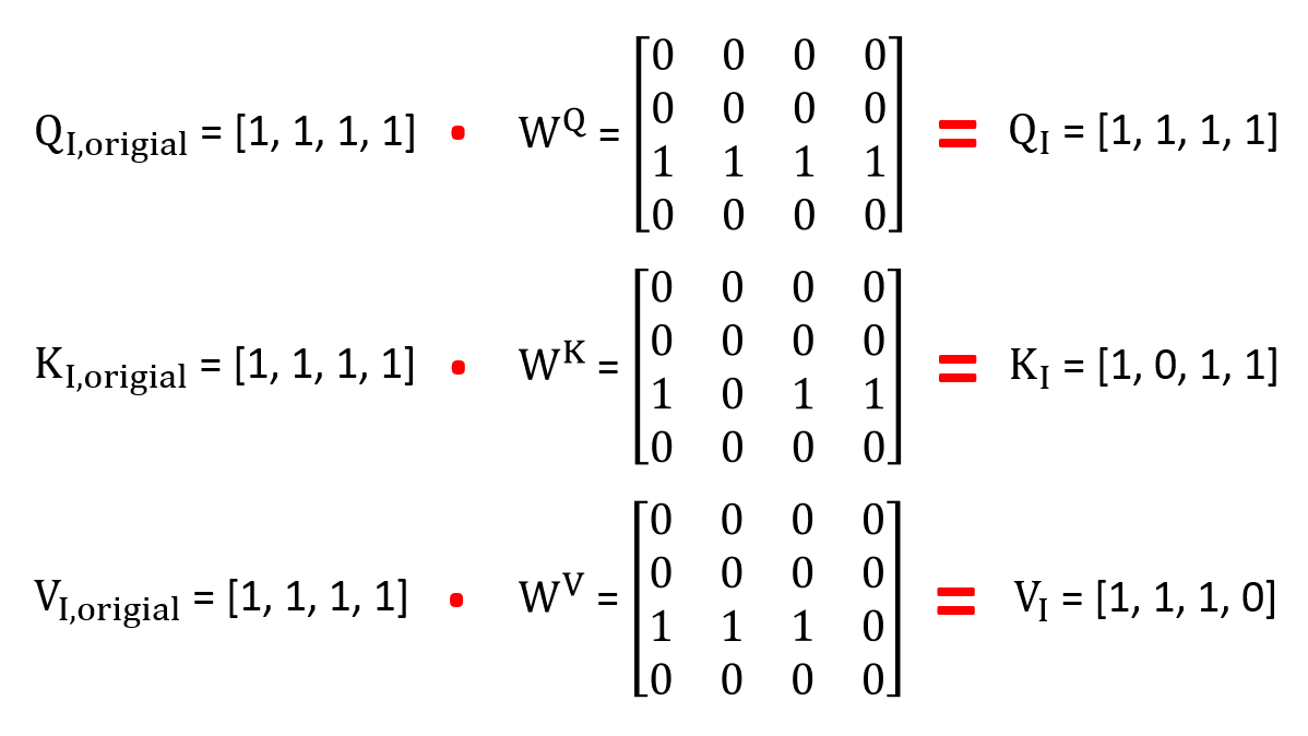 예를 들어 "I am a student."라는 문장이 있다고 가정하겠습니다. 여기서 각 단어를 Attention 메커니즘을 사용하기 위해 임베딩을 해주어야 합니다. 위에서 단어 "I"의 임베딩이 [1, 1, 1, 1]이라 했을 때 처음 I의 처음 Query, Key, Value를 각각 Q_I, original, K_I,original, V_I,original라고 합니다. 이 값들은 위에서 설명했듯이 Self Attention 메커니즘에서 같아야 되기 때문에 모두 [1, 1, 1, 1]로 동일합니다. 이때 각각 학습된 weight 값이 WQ, WK, WV라고 할 때. 이를 위에서 처럼 original값들과 점곱을 해주면 최종적은 Q, K, V값이 도출됩니다.