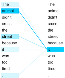 첫 번째 메커니즘은 Self Attention입니다. "Self Attention"이란 말 그대로 Attention을 자기 자신한테 취한다는 것입니다. 그럼 도대체 왜 이런 행위를 하는 것일까요? 그 이유는 바로 문장에서의 단어들의 연관성을 알기위해서 입니다. 위 그림에는 "The animal didn't cross the street because it was too tired."라는 문장이 있습니다. 여기서 "it"이 가리키는 단어는 무엇일까요? 사람은 문맥상 it이 animal을 가리킨다는 것을 쉽게 알 수 있습니다. 그러나 컴퓨터에게는 이러한 과정이 매우 어렵습니다. 이를 쉽게 해주는 방법이 Self Attention입니다.