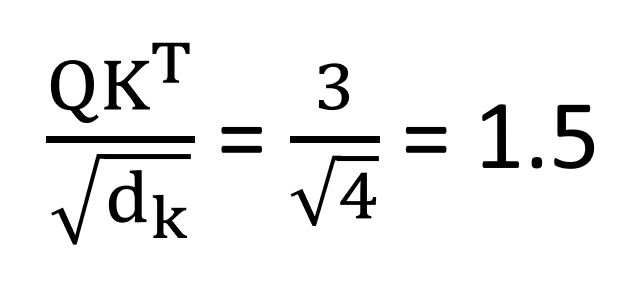 이 Q, K, V값을 이용해 위에서 설명한 보정 Attention score을 주해주면 위와 같이 1.5라는 값이 나옵니다. 행렬 Q, K는 서로 점곱을 해주고, 여기서 행렬 Q, K, V의 차원은 4이므로 루트 4를 나누어준 것입니다.