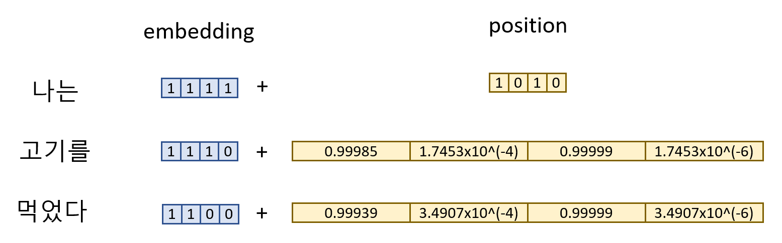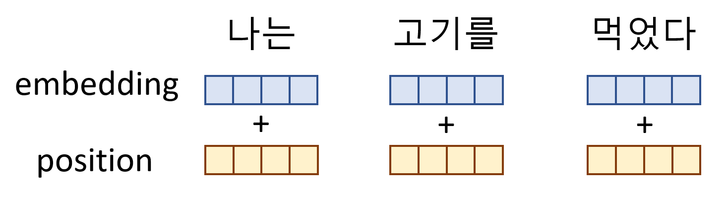 그러면 어떻게 이러한 시간 순서 문제를 해결할 수 있을까요? 답은 의외로 간단합니다. 각 단어 임베딩에 순서가 들어간 정보를 더해주면됩니다. 예를 들어 위에서 "나는 고기를 먹었다."라는 문장의 경우 각 단어들의 embedding 벡터에 각 단어들의 position embedding을 아래와 같이 더해주면 됩니다.