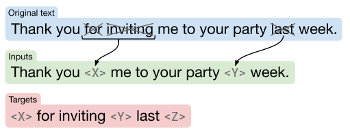 - 그다음 "for"과 "inviting"은 연속된 단어들 이므로 하나의 span으로 간주하여 "X"로 masking 함. "last"역시 "Y"로 masking 함