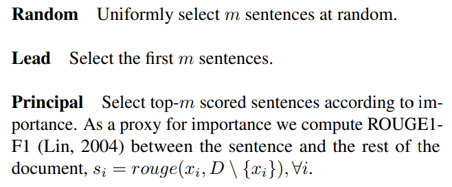 - Lead: m개 문장들을 문서의 앞 부분 부터 순서대로 선택