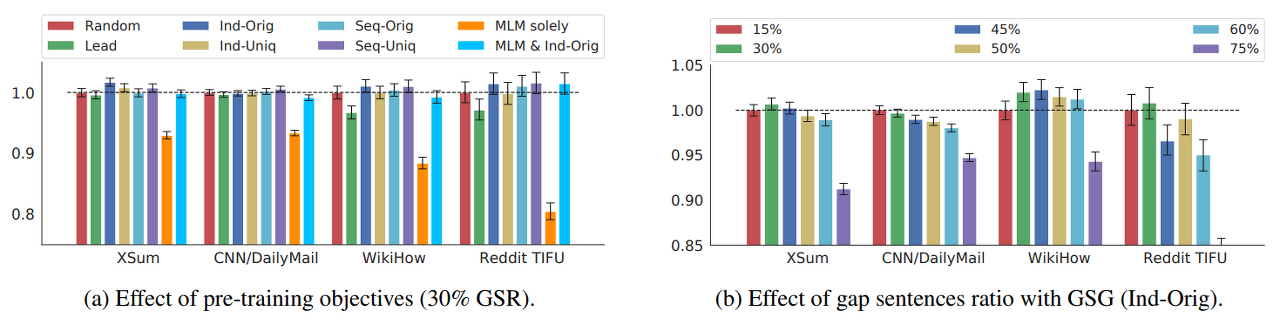 - PEGSUS 모델에서 GSG와 MLM 방식이 둘 다 사용되었으나, MLM 방식이 down-stream task의 성능 향상에 영향을 끼치지 못해 최종 모델에서 제외함