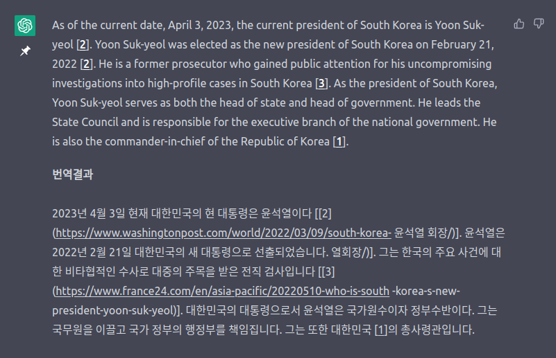 다음은 프롬프트 지니를 이용하여 ChatGPT에게 "현재 대한민국의 대통령은?"이라고 질문한 답변입니다. 보시다시피 영문 답변에 대해 한국로 번역이 되어 2개다 print된 것을 확인 할 수 있습니다. 즉 '프롬프트 지니'는 ChatGPT의 효율을 높이기 위해 영문으로 질문하고 영문답변을 얻어 다시 국문으로 바꾸어주는 작업을 합니다.