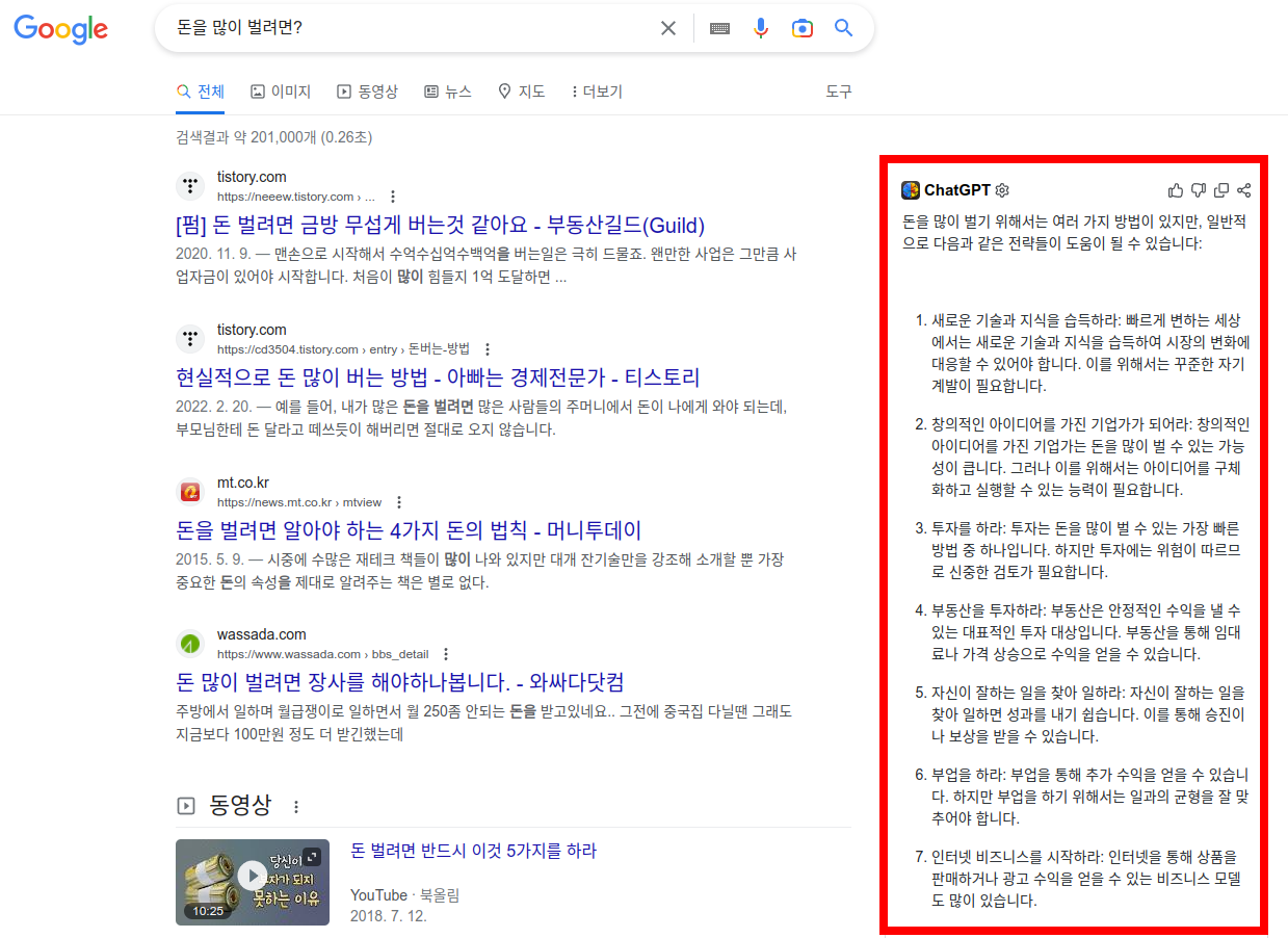 이제 실제로 구글에 물음표(?) 형태로 검색을 하면 위와같이 오른쪽에 ChatGPT가 답변을 해주는 모습을 보실수 있습니다.
