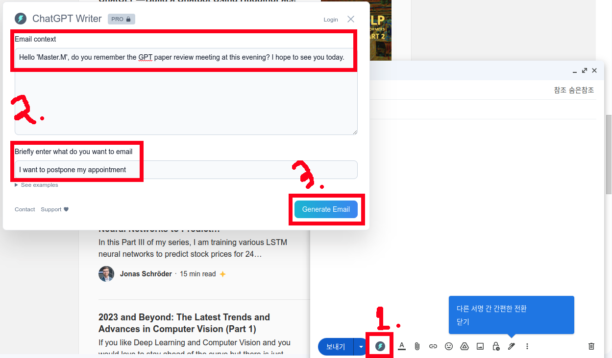 이 확장프로그램은 이메일 작업이 많으신 분들께 추천드립니다. 이메일이 온 내용을 입력하고 내가 답장하고 싶은 문맥을 알려주면 ChatGPT가 알아서 답장을 작성해줍니다.