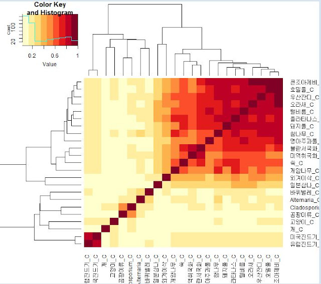 단어를 벡터로 임베딩 하면 단어간 유사도를 구할 수 있습니다. 위 그래프에서 진한 붉은색은 높은 유사도를, 연한색은 낮은 유사도를 의미합니다. 진드기류는 진드기류끼리, 식물은 식물류끼리 비슷한 것을 확인 할 수 있습니다.