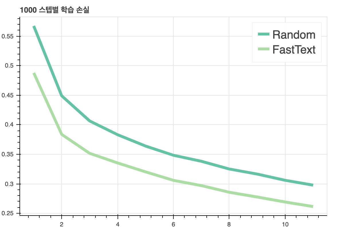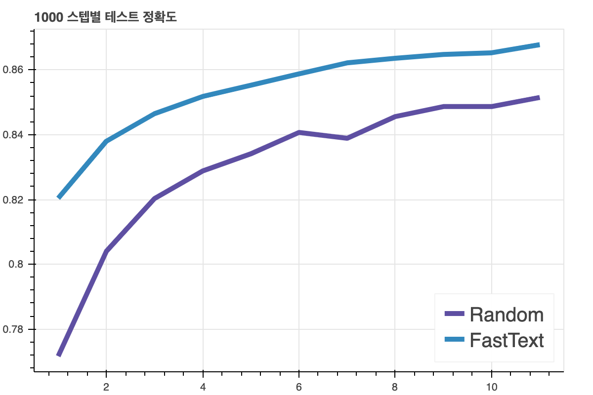 아래 그림들은 긍/부정 문서 분류 task에 '전이학습'결과를 보여준 것입니다. 'FastText'는 기존에 학습된 임베딩을 학습에 사용한 것이고, Random은 처음에 랜덤한 임베딩을 사용한 것입니다. 그래프에서 보시다 시피 전이학습을 한 모델의 성능이 더 좋습니다.