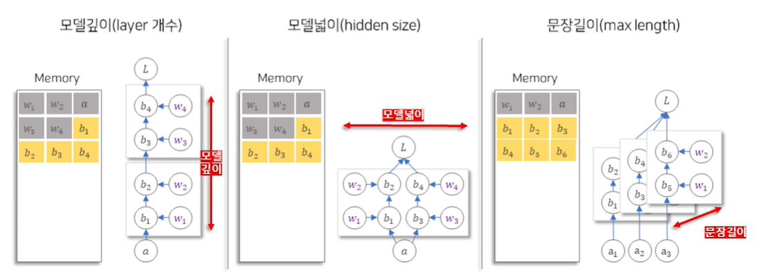 - 따라서 위와 같이 모델의 배치 사이즈, 싶이, 넓이, 문장 길이 등이 커지면 중간 결과물들의 크기가 증가하여 메모리도 증가함