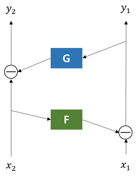 - 입력값 x를 복사하여 x1, x2로 구성, Reversible Network를 통과한 결괏값 y1, y2는 평균하여 y로 변경
