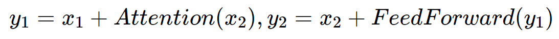 앞에서 언급했듯이 기존 Transformer의 Residual Block은 역전파를 위해 중간 결과를 따로 저장. 때문에 모델이 깊어져 layer가 많아질수록 메모리양이 증가. 이를 해결하기 위해 'Reversible Transformer'개념 도입.