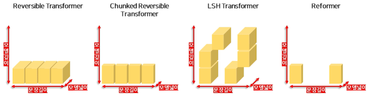 - Reversible Transformer : 중간 계산 과정을 저장할 필요가 없어 모델의 깊이가 줄어듦
