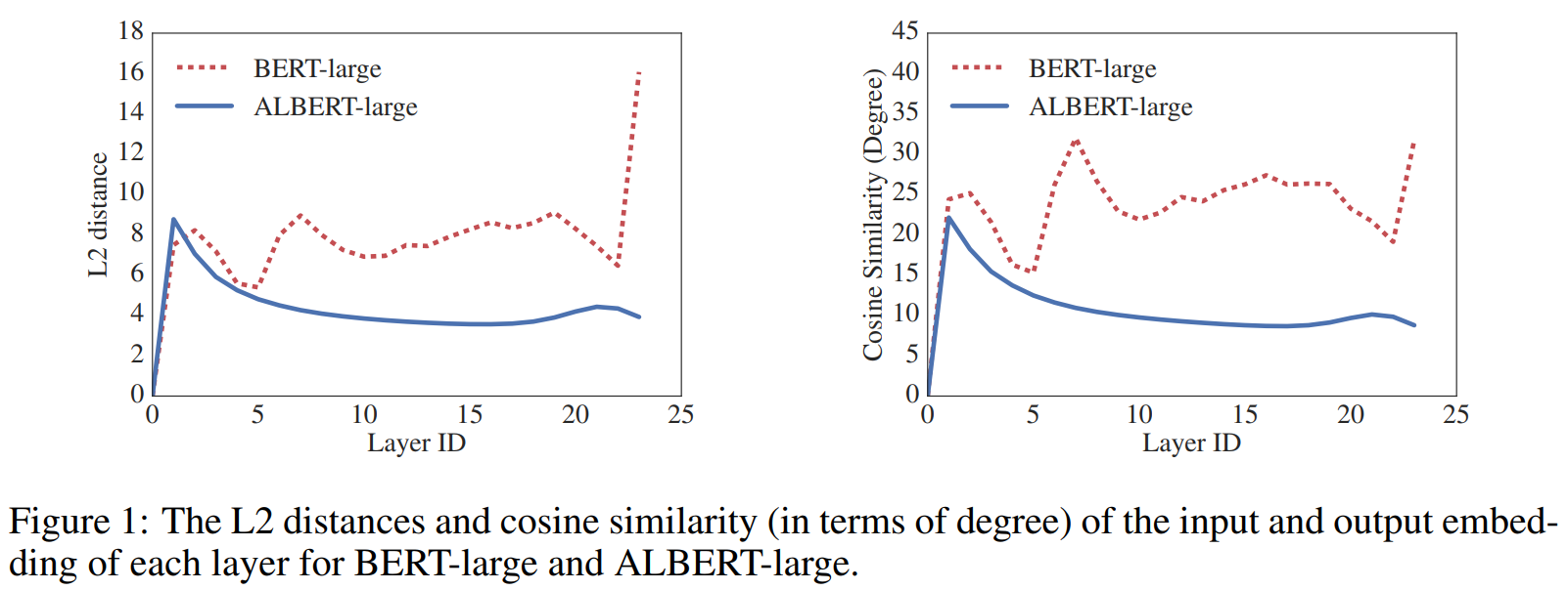 - 보다시피 ALBERT에서 파라미터들이 layer가 깊어질수록 안정적으로 수렴하는 경향성을 보이고 있는것을 확인할 수 있음