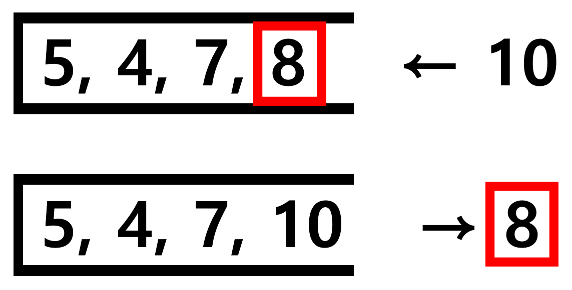 스택(stack)은 끝이 막혀있는 좁은 주차장과 같습니다. 이 경우 위 그림과 같이 먼저 들어간 차(5번 차)가 가장 나중에 나올 수 있게 되며, 가장 나중에 들어간 차(8번 차)가 가장 빨리 나올 수 있습니다. 때문에 새로운 10번 차가 왔을 때 가장 나중에 들어간 8번 차가 나오고 이 자리를 10번 차가 대신하면 됩니다.