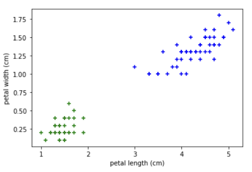plt.scatter(df0['petal length (cm)'], df0['petal width (cm)'], color = 'green', marker = '+')