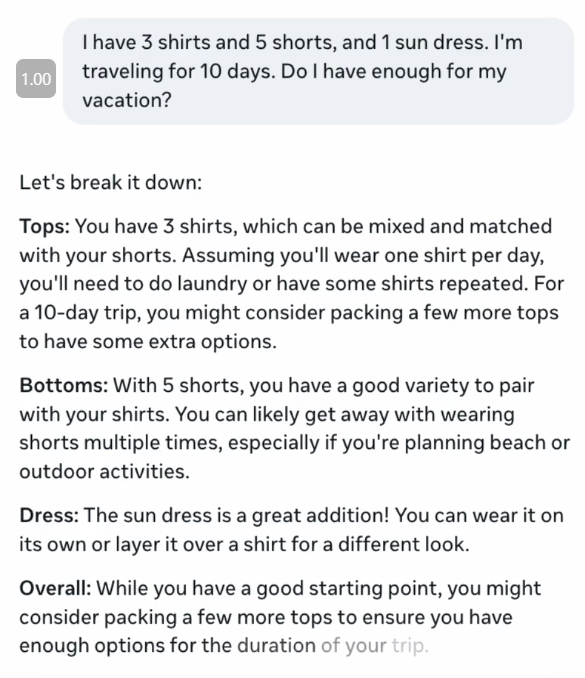- Complex reasoning(복잡한 추론): 사람이 잘 하는 복잡한 추론 문제도 풀 수 있습니다. 다음과 같이 휴가 때 입을 옷에 대해 문의를 하면, 이를 분석해서 최적의 답을 찾아줍니다.