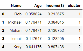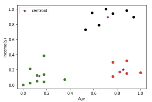 icome csv를 불러와 데이터 프레임을 만들어줍니다. 그다음 MinMaxScaler알고리즘을 사용하여 Age와 Income을 정규화해줍니다.