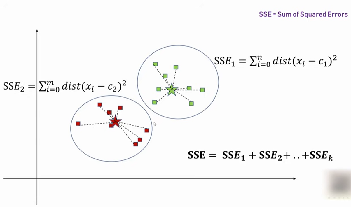 K-평균 알고리즘(K-means clustering algorithm)은 원하는 클러스터의 수를 정해주면 이 숫자만큼 아래 그림과 같이 클러 시터 링을 해줍니다. 이때 클러스터링 하는 기준은 아래 그림처럼 SSE(Sum of Squared Errors) 즉 에러들의 합이 가장 작게 하는 것입니다.